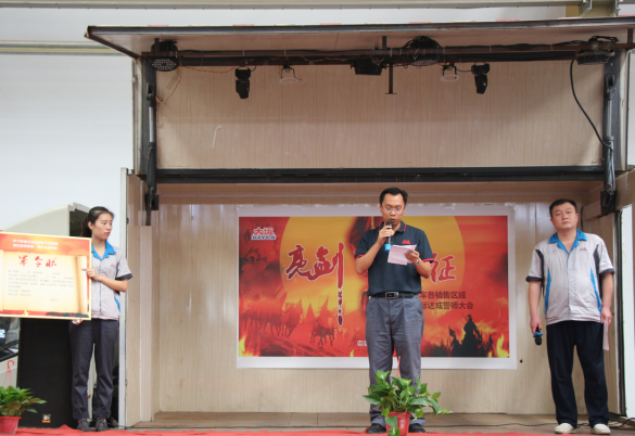 首先,他对周总因公出差不能亲临现场的情况进行了说明,并代周总对我们此次誓师大会的所有营销精英们问好,他表示,周总虽出差在外,但是仍关心着我们本次大会的召开,所以特将此次誓师大会所有事项授权委托给我和销售副总助理卢传祥,希望我们能够将活动组织好、策划好,同时希望大家能够振奋精神,昂扬斗志,带着大运公司领导和员工们的信任迎难而上,奋勇拼搏,努力完成9月份销售任务目标。