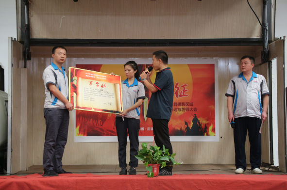 接着,市场处经理邓力对公司9月份的任务量及目标进行了宣读,将目标任务逐层进行分解,让每一位销售精英们做到心中有数,奋力拼搏。之后,本次活动最为核心的环节——营销精英誓师,在市场处市场管理科主管吴晓旭激情昂扬地带动下隆重开启,吴主管组织各大区经理逐个上台,面对现场全体干部员工,激情而又庄严地宣读了9月份销量目标军令状,并郑重地按下手印,承诺:奋战30天,使命必达!宣誓完毕后,公司领导为营销精英们披绶带,戴红花,握手祝福,殷切预祝他们9月份旗开得胜、马到功成,达成宣誓目标。