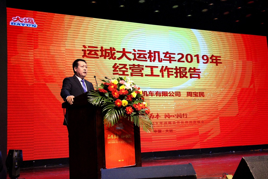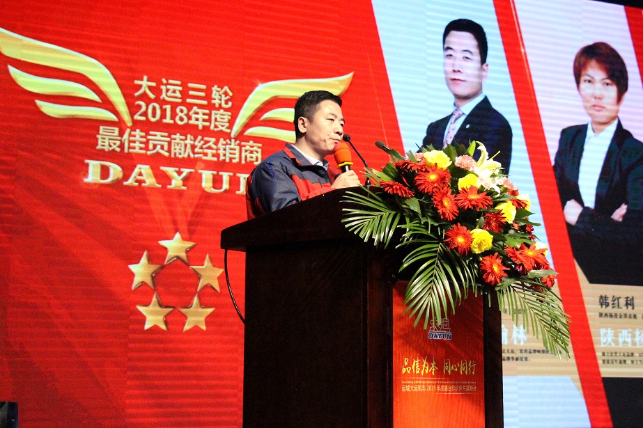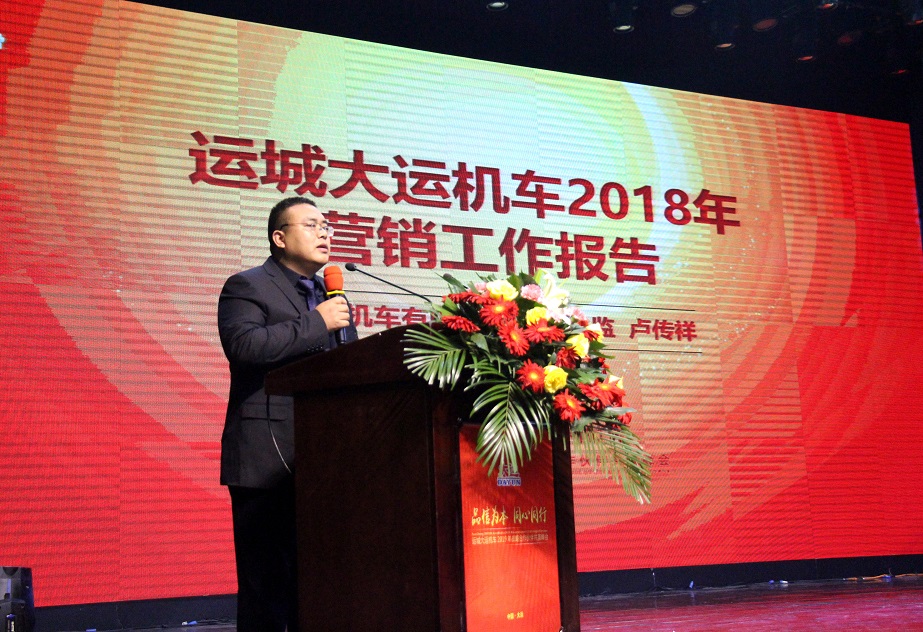 获奖经销商代表,陕西创天商贸有限公司李彦宏先生,在经销商发言环节中提到,2018年成绩斐然,相比2017年销量提升53%。2019年,在市场疲软的情况下,会尽最大的努力争夺市场份额,因为大运品牌驰名中外;因为大运有自主发动机、全资独立工厂;更因大运有能量,团队有信心。